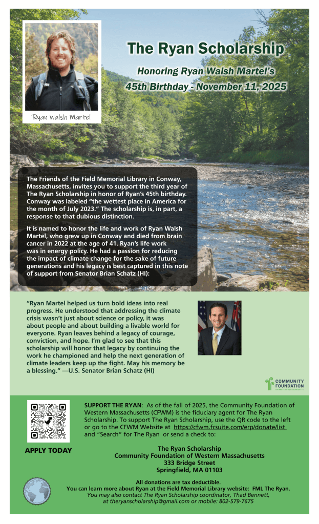 We are pleased to announce that 3 members of the Conway community are serving on The Ryan Scholarship Committee. They are: Nate Perry, a friend of Ryan’s since the age of four, and Marlene Znoy and Michael Mandile, who both watched Ryan grow up over the years. We are thankful to have people who have known Ryan all of his life, know his Conway roots, understand his passion for addressing climate change and who are excited to help the scholarship project move forward. The committee recently finalized the 2024 application and is working to publicize the scholarship to the town, local schools and any homeschooling seniors.
